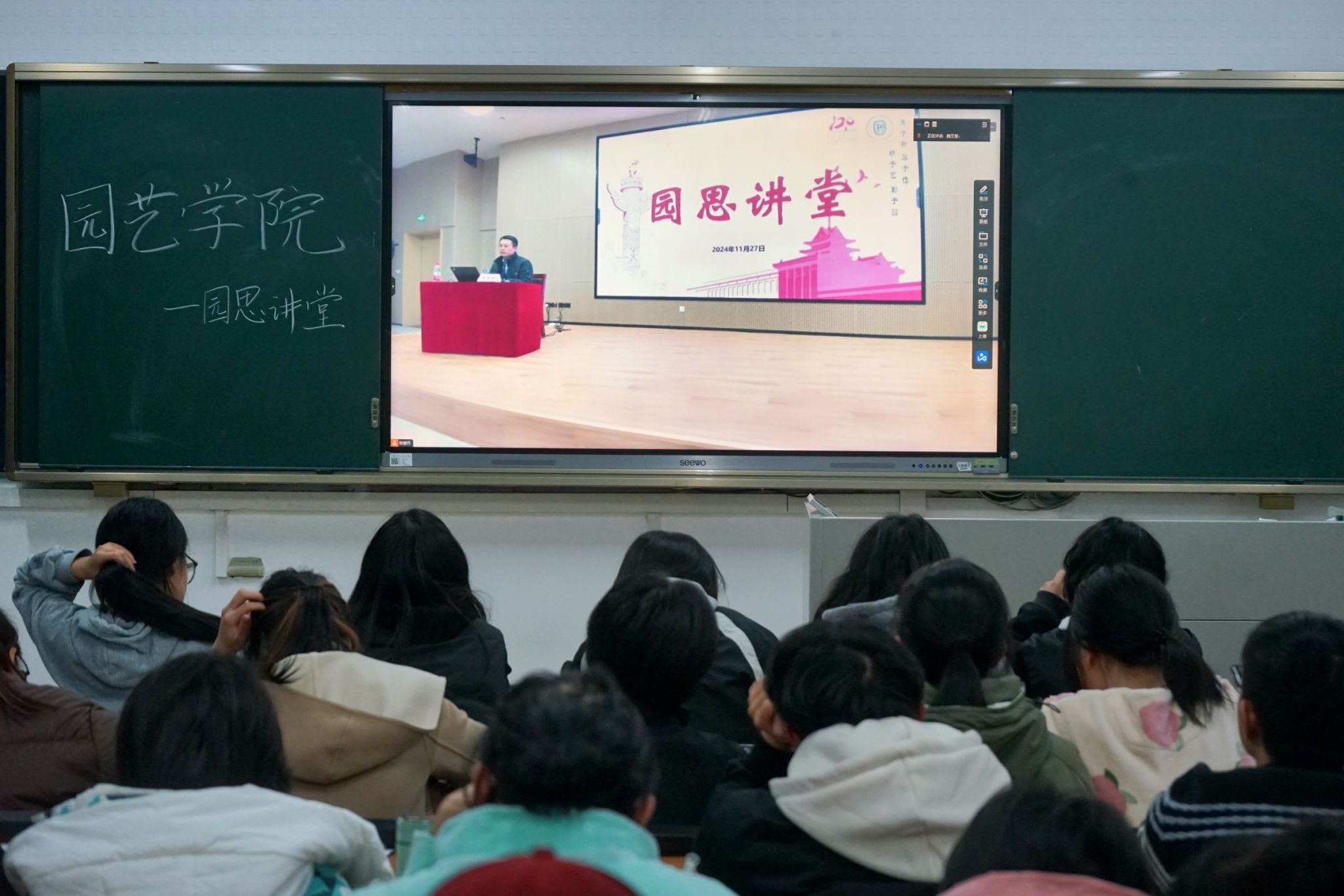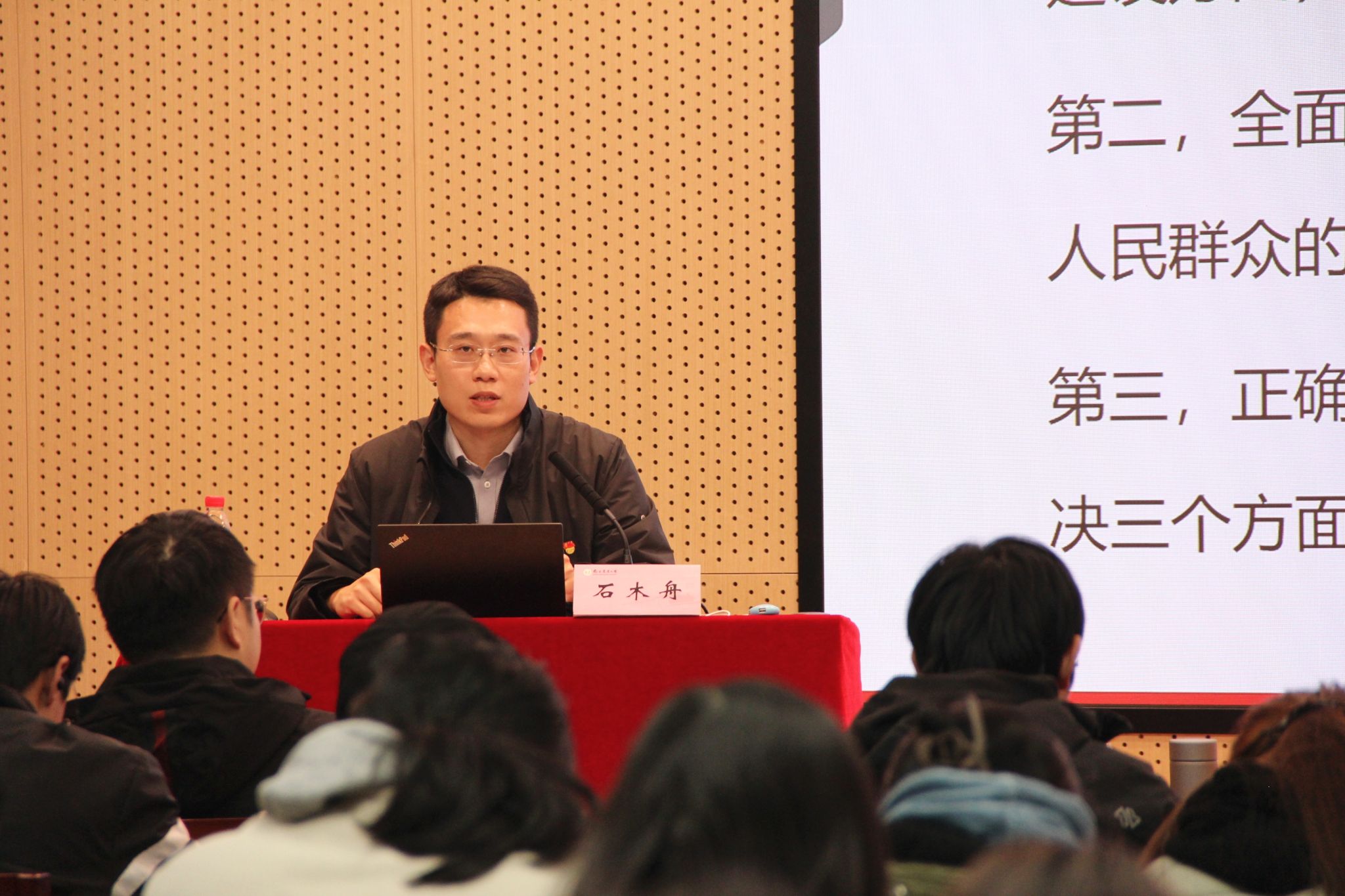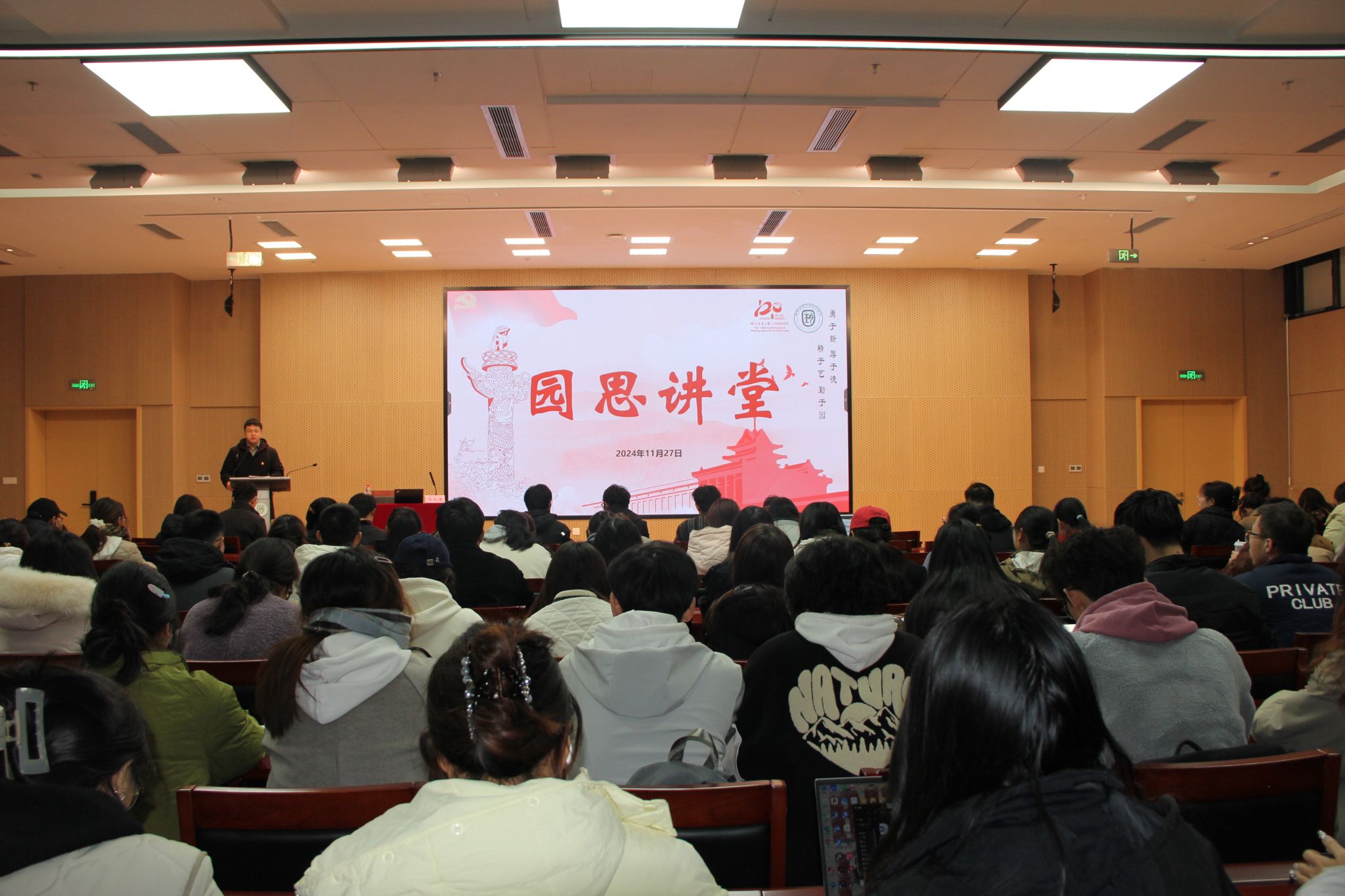 11月27日下午,成人有声小说 “园思讲堂”系列讲座之“永不褪色的信仰——党章之路”主题党课在滨江校区园艺楼142举办。本次党课成人有声小说 党委副书记石木舟主讲,成人有声小说 辅导员赵家豪主持本次活动以滨江校区为主会场,卫岗校区进行同步转播共计约260名入党积极分子和入党启蒙学员参加