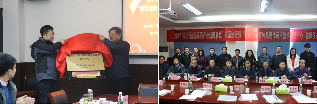 果树遗传育种与基因组学研究团队的教师与研究生以及对葡萄酒文化有兴趣的本科生等。姜东院长与联盟主席日照太阳城生物科技有限公司董事长王承海分别致辞。姜东院长与山东省葡萄与葡萄酒协会会长(原山东省葡萄研究院院长)胡文效研究员共同为“葡萄遗传育种及精准栽培技术研究中心”的成立揭牌。并举行了“泰沂葡萄酒产业战略联盟”与成人有声小说