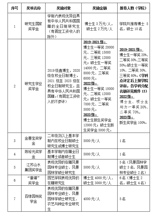 3、名额分配及奖励标准:2023年百绿园林奖学金名额共计5人(4000元/人),获奖学生专业必须是风景园林学、风景园林、农艺与种业。具体名额分配详见附件13。