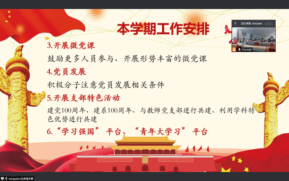 会议最后一项是本学期工作的安排。支部副书记向支部全员介绍了本学期的工作重点。一是开展党史学习教育,要开展专题学习;专题培训;专题党课;实践活动;专题组织生活会;二是要做好工作迎接党委巡查工作,支部内部进行自查,严格完善制度执行等,希望每位党员都能重视起来,提高自身的政治修养。