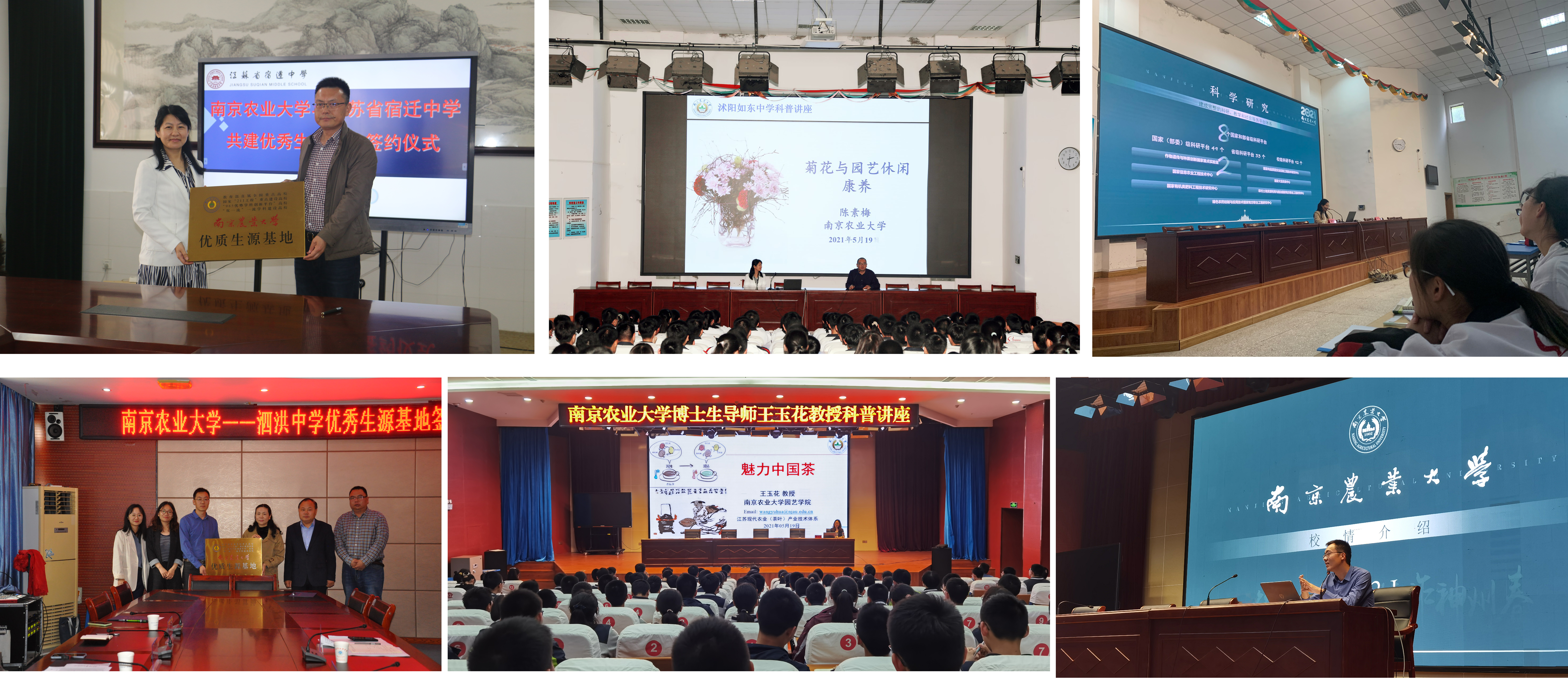 陈素梅、窦靓、夏丽去往宿迁中学、沭阳如东中学,与两校进行深入交流,并与宿迁中学进行优质生源基地中学签约授牌。在沭阳如东中学,陈素梅教授为学生作《菊花与园艺休闲康养》的科普讲座,夏丽做校情介绍报告,学生积极互动。