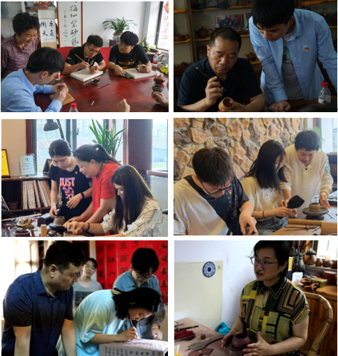 宜兴的第一站,党员们前往宜兴市博物馆参观。在参观过程中,党员们了解了蒋南翔、周培源、徐悲鸿等宜兴名人的事迹,这其中不乏优秀的中国共产党员和爱国人士,他们通过自身不懈的努力,在各自的领域崭露头角,也正是因为背靠强大的祖国,他们能够更加安心地建功立业,为后世留下宝贵的精神财富。而后,党员们前往江苏省宜兴紫砂工艺厂,在负责人的带领下观摩紫砂大师的作品,学习紫砂壶的制作和鉴赏知识。观览结束,6位非遗紫砂传承人为党员们现场展示紫砂壶的制作和雕刻技术,并邀请师生们以“建党百年”“ 园艺百年”为主题,进行紫砂壶等艺术作品的创作。在体验的过程中,师生们感受到做一把“好壶”的不易,也感受到这一非物质文化遗产的魅力所在。同学们纷纷表示,要做美的使者,在党史学习中增强文化自信,让更多人了解紫砂的魅力,保护、宣传好国家的传统文化和技艺;要向这些非遗传承人学习,将这种“匠人精神”融入平时的工作和生活中,踏实走好人生的每一步。