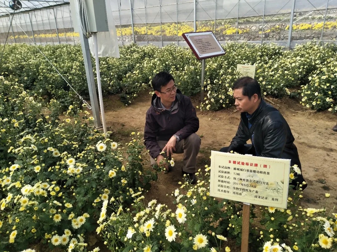 团队成员管志勇教授(左一)在麻城指导菊花生产