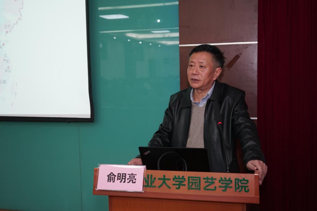 党委书记韩健向大家介绍了俞明亮研究员的经历与成就,俞明亮是中国园艺学会桃分会理事长、江苏省园艺学会理事长,江苏省农业科学院果树研究所二级研究员,博士生导师,享受国务院特殊津贴,从事桃种质资源与新品种选育研究近30年,主持承担国家、部、省级各类课题30余项。培育桃新品种20多个,其中7个品种获得植物新品种权证书;获科技成果奖4项,发表学术论文50余篇,其中SCI论文15篇;是江苏省“333高层次人才培养工程”中青年科学技术带头人,江苏省有突出贡献的中青年专家,国家桃产业技术体系遗传改良研究室主任、鲜食桃品种改良岗位科学家,江苏省农业科学院领军人才,重点学科负责人。
