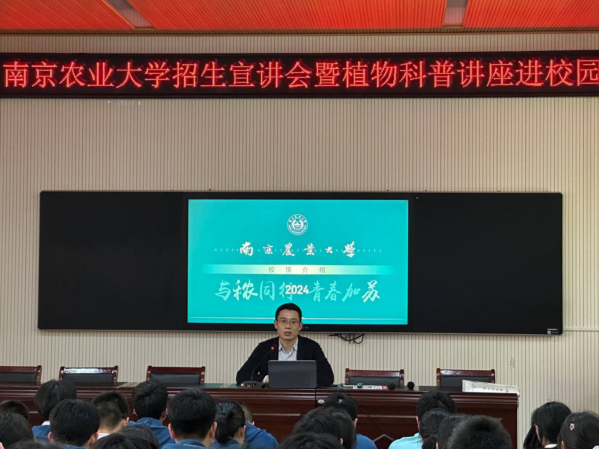 党委副书记石木舟、副教授王鹏、辅导员崔洋一行赴江苏省宿迁市泗洪中学开展招生宣讲会暨植物科普讲座进校园活动。泗洪中学党委委员、副校长许磊及高二年级150余名学生参加了此次活动。