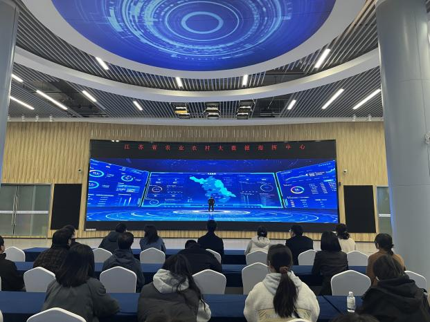 支部党员走进农创中心百家企业展馆与高新技术产品馆。展馆内汇集了百余家农业科技企业的创新成果,琳琅满目的展品全景式呈现了现代农业的科技图景。党员们驻足于园艺作物智能化管理设备展区,结合学院学科特色,重点调研了先进技术的产业化应用进展。活动最后一站来到江苏省农业农村大数据指挥中心,巨型电子屏上实时跳动着省内农业农村的数据流,工作人员通过演示平台如何通过AI算法预测与农业相关的各项数据,让支部党员深切感受到大数据与人工智能正深刻重构农业生产方式,也为园艺学科数字化转型提供了重要启示。