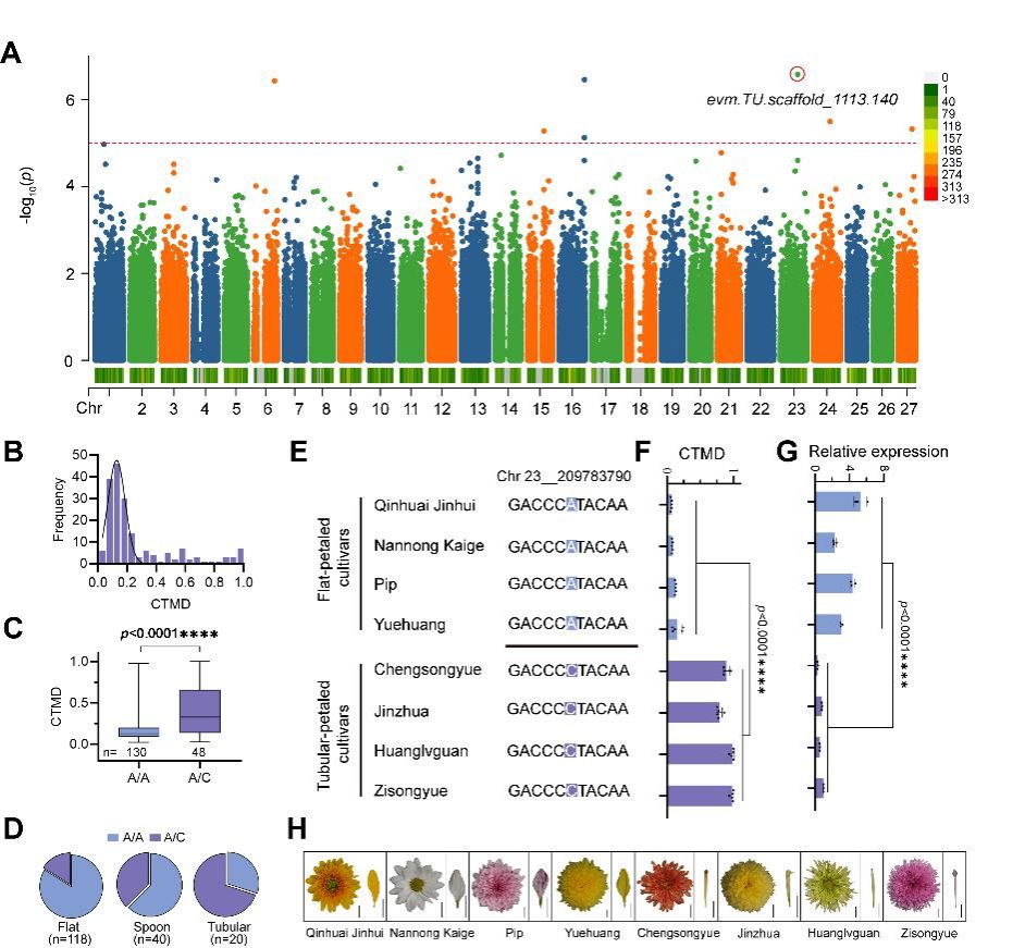 研究以200份切花菊种质为材料,对舌状花花冠筒融合程度这一关键性状开展全基因组关联分析,共定位到7个显著关联的SNP位点,并在区间内筛选获得103个候选基因。联合平瓣与管瓣品种的舌状花转录组差异表达基因分析,锁定位于23号染色体上的生长素响应基因CmSAUR66,该基因在平瓣型菊花中显著高表达,在管瓣型材料中表达显著降低,其所在区间的关键SNP位点与花冠筒融合程度表型呈显著关联,结果表明CmSAUR66是调控舌状花花冠筒形态建成的关键候选基因。