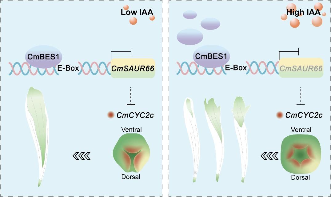 该研究首次将生长素、油菜素内酯信号与花瓣背腹不对称发育调控统一于同一通路,证实油菜素内酯核心基因CmBES1可作为生长素信号的下游枢纽,破解了菊花舌状花花冠筒发育的分子密码。首次阐明了被子植物中早期合瓣花花冠筒发育机制,完善了菊花头状花序发育的生长素模型。相关成果为菊科观赏植物花型分子设计育种提供了关键靶标基因与理论支撑。