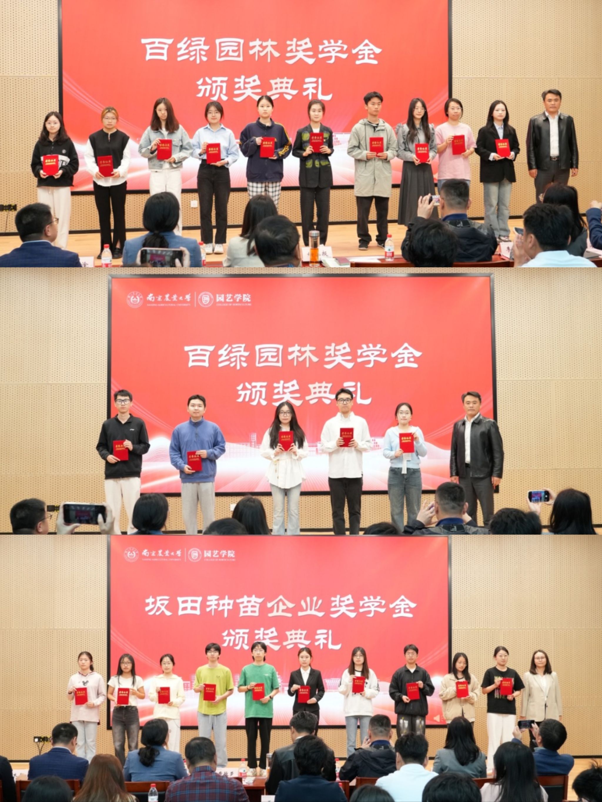 奖助学金颁奖典礼暨“园艺青年YOUNG”主题汇报会在滨江校区隆重举办。江苏百绿园林集团有限公司副总经理、党支部书记姚礼报、坂田种苗(苏州)有限公司总务管理部副部长曹敏亚、创想姜来(江苏) 农业科技有限公司总经理于超、章镇奖学金设奖家属代表章元、南京云几文化产业发展有限公司执行董事王蕾、南京药业股份有限公司总经理张文、金埔园林股份有限公司副总裁杨晓波、南京拙景园林规划工程有限公司人事经理李慧娟、江苏百绿园林集团有限公司高级人力资源专业师章星星,校学生工作处副处长李阿特、校团委副书记方淦,成人有声小说