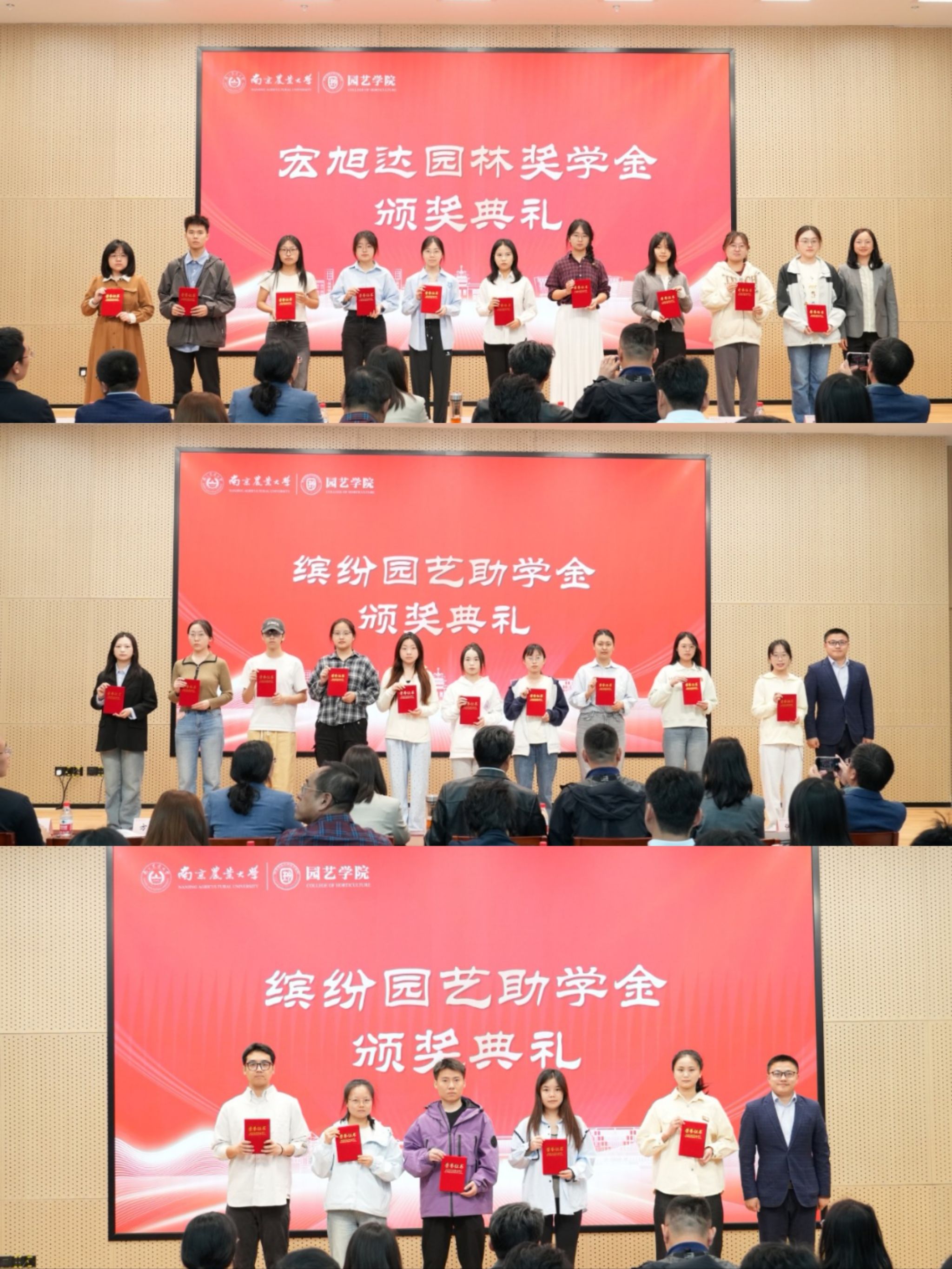 会议期间,大会为获百绿园林奖学金、坂田种苗企业奖学金、厚德奖学金(于超项目)、宏旭达园林奖学金、缤纷园艺助学金、章镇奖学金、心路助学金的70余名获奖同学颁发获奖证书,并为全国研究生乡村振兴案例大赛金奖团队、江苏大学生创新大赛等共计12项省级以上奖项获奖学生集体及个人颁发“园艺青年榜样集体”、“园艺青年榜样个人”证书。