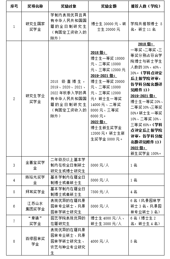 3、名额分配及奖励标准:2022年百绿园林奖学金名额共计5人(4000元/人),获奖学生专业必须是风景园林学、风景园林、农艺与种业。具体名额分配详见附件14。
