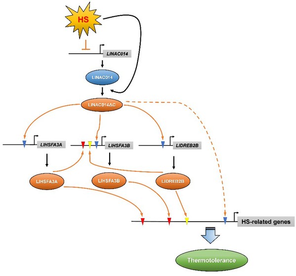 图1. LlNAC014通过激活DREB2-HSFA3模块正向调控百合耐热性的分子通路