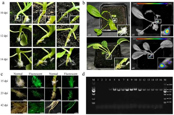 (1)建立了适用于不结球白菜活体植株的两步转化法(图1),通过表型检测、荧光观察和PCR分析,鉴定了两步法诱导后复合植株中的转基因根系(图2)。同时,两步法侵染后,5日龄(下胚轴较为纤细)不结球品种(SZQ、HMG、WYM、CX)的转化效率43.33%-51.09%,30日龄(下胚轴较为粗壮)的不结球白菜CX品种转化效率可达到54.88%。