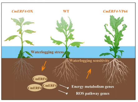 该研究发现,CmERF4受涝渍胁迫诱导上调表达,属于ERFVIIIa亚家族,具有转录抑制活性。过表达该基因降低了菊花的耐涝性,而CmERF4-VP64转基因株系的耐涝性显著增强,这说明CmERF4负调控菊花的耐涝性(图1)。