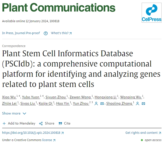 张绍铃院士与普渡大学Yun Zhou教授课题组在Plant Communications发表题为Plant Stem Cell Informatics Database(PSCIdb): a comprehensive computational platform for identifying and analyzing genes related to plant stem cells的论文,构建了植物干细胞信息学分析平台PSCIdb(//www.plantstemcelldb.org.cn),为跨物种干细胞基因比较、功能和进化研究提供重要宝贵的资源。