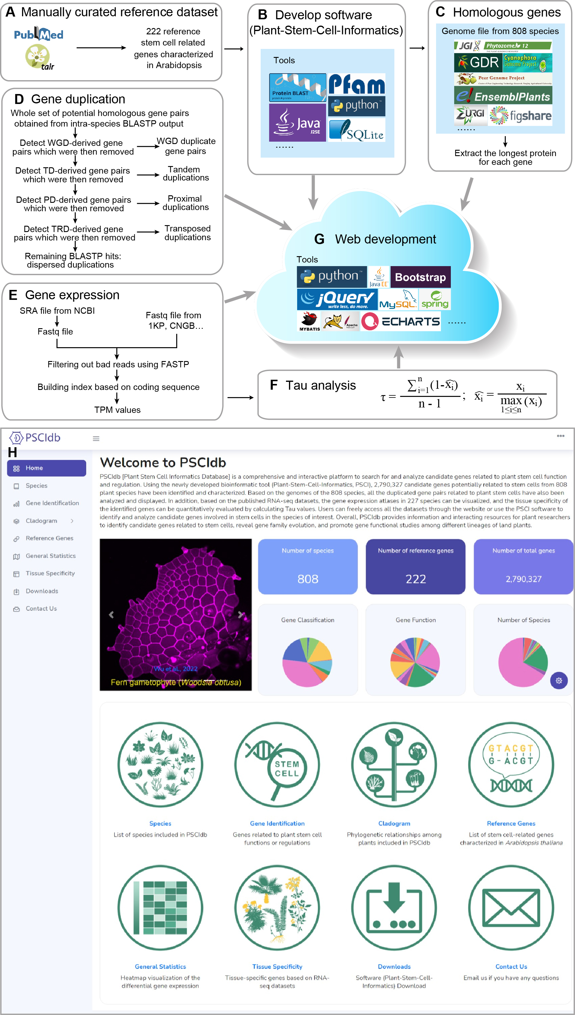 该研究利用自主研发的Plant-Stem-Cell-Informatics软件,在808个植物物种中鉴定干细胞通路相关的2,790,327个候选基因。同时提供了这些物种中与干细胞相关的重复基因对和227个物种基因表达谱等信息。最后,作者整合这些信息开发成数据库。整个数据库提供了主页、物种查阅、进化树、参考基因、数据统计分析、组织特异性、下载和联系九个功能模块,方便读者使用。