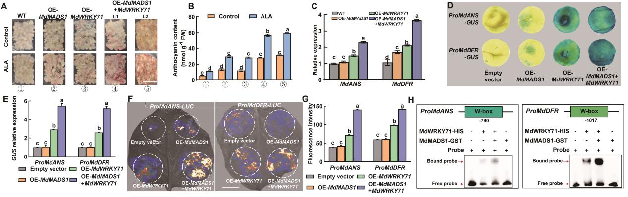 其次,利用酵母双杂筛库,发现一个新的能与MdMADS1互作的WRKY转录因子MdWRKY71。Y1H、EMSA、LUC、GUS试验确认,MdWRKY71能结合MdDFR、MdANS以及MdMADS1启动子,并激活三种基因表达。蛋白质互作效应试验显示,MdWRKY71与MdMADS1的互作既增强MdMADS1与MdCHS和MdUFGT的启动子结合(图3),也增强MdWRKY71与靶基因MdDFR和MdANS启动子结合(图4)。因而,ALA诱导的MdMADS1-MdWRKY71模块互惠互利地促进苹果花青苷积累过程。但是,MdMADS1处于MdWRKY71调控的下游,对上游MdWRKY71基因表达没有调控活性。