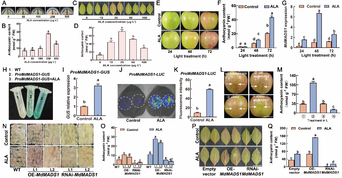 苹果是我国最重要的落叶果树,其果实芳香艳丽深受广大消费者喜爱。苹果的外观色泽是影响果实品质的重要因素,鲜红亮丽的果实更具市场竞争力,而果实红色主要由花青苷含量决定。5-氨基乙酰丙酸(ALA)是一种新型植物生长调节物质,具有显著促进苹果花青苷合成功能。该团队最先发现这一功能,并且获得农业农村部批准,使ALA成为我国第一拥有完全知识产权的苹果增色剂。经转录组和蛋白质组学分析,他们在ALA处理后的苹果果皮中鉴定到MADS-box转录因子MdMADS1,证明其参与ALA诱导花青苷积累,但其作用机制尚不清楚。本研究以ALA诱导MdMADS1基因表达为切入点,运用多种分子生物学手段,深入细致地解析了ALA诱导花青苷积累的转录调控机制。