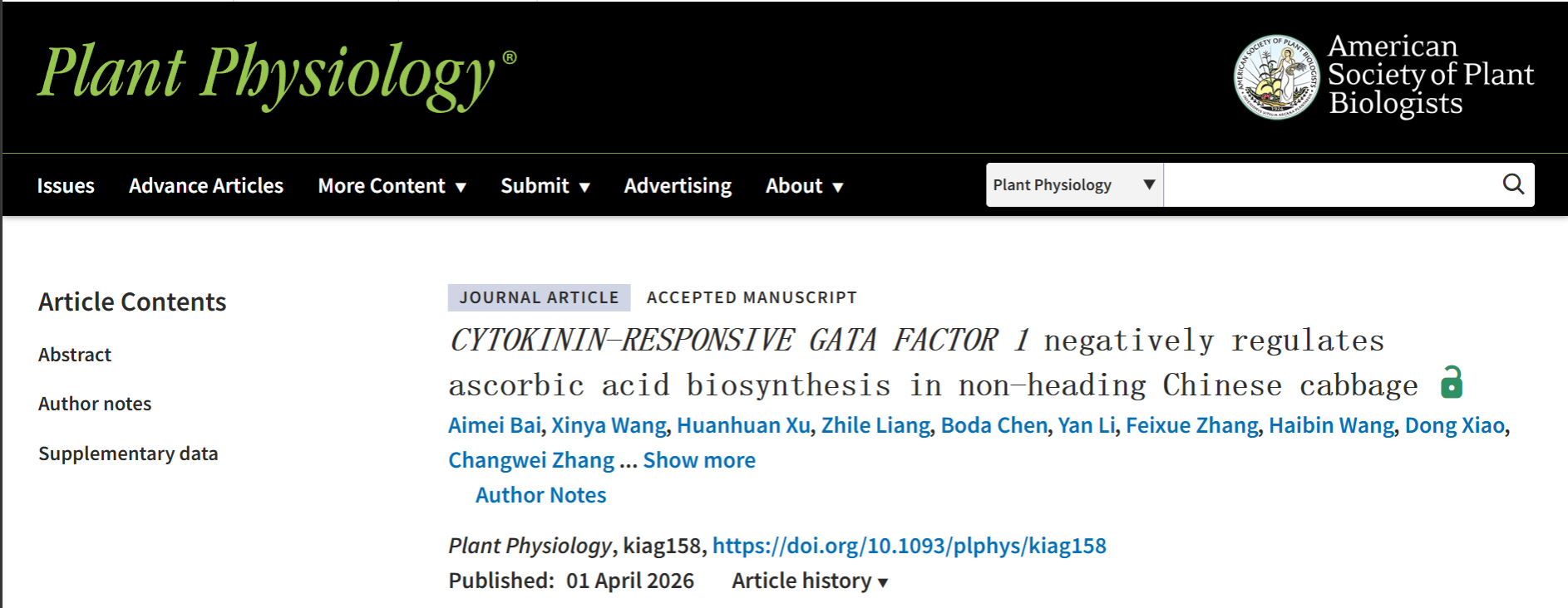 近日,成人有声小说 白菜系统生物学实验室在国际植物学期刊《Plant Physiology》在线发表题为“CYTOKININ-RESPONSIVE GATA FACTOR 1 negatively regulates ascorbic acid biosynthesis in non-heading Chinese cabbage”的研究论文,该研究锁定了调控AsA积累的关键GATA转录因子BcCGA1,揭示了BcCGA1通过直接抑制AsA合成关键基因转录负调控AsA积累的分子调控机制,为不结球白菜营养品质的分子改良奠定了遗传基础。