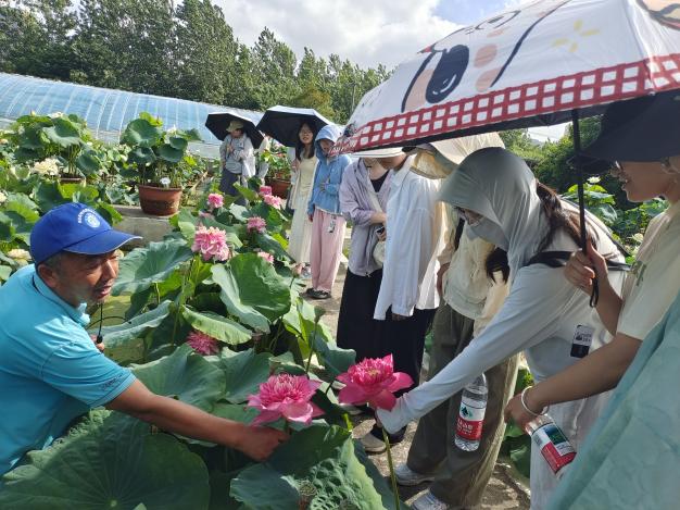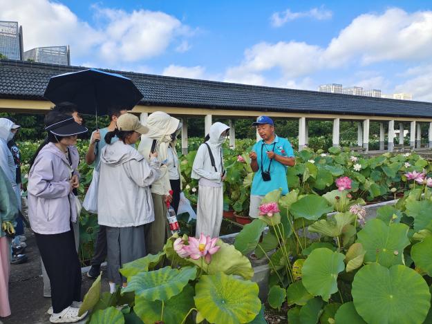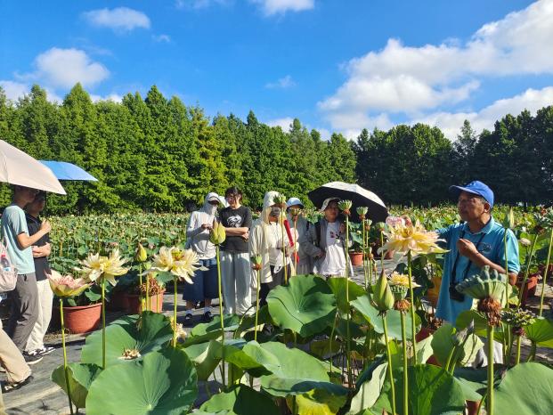 迎着东升的旭日,在公司董事长、成人有声小说 兼职教授丁跃生带领下,大家步入南京浦口艺莲苑花卉有限公司荷花基地,千余个自主培育与收集引进的荷花品种正值盛放、香远益清、姿态万千。丁老师在系统介绍荷花种质资源情况及产业发展现状的同时,也引导大家进行了多感官体验。丁老师潜心荷花育种十余年,他深情地回顾了自身在科研道路上遇到的技术挑战与艰苦条件,分享中同学们深刻感受到以丁老师为代表的科研人员在艰难环境中坚守初心、持续奋斗的历程,以及推动中国荷花走向国际、传播中华荷文化的实践与思考。党员们深受触动,不仅感动于老一辈育种人坚韧不拔、迎难而上的精神,也对淡泊名利、潜心研究的科研操守有了更深刻的理解,更为我国丰富的荷花种质资源与不断提升的科技实力感到自豪,民族认同与文化自信进一步增强。
